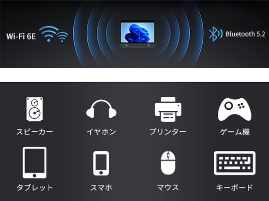 ワイヤレス接続は最大通信速度9.6Gbpsの最新型Wi-Fi 6E(802.11ax)とBluetooth 5.2に対応しており、高速で安定したネットワーク接続と便利なデバイス接続を提供します。