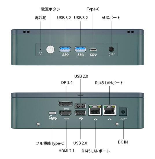 インターフェイスはフル機能Type-Cポート、USB Type-Cポート、HDMIポート、DPポート、RJ45 LANポート×2、USB 3.2×2、USB 2.0×2、AUXポートを備えます。