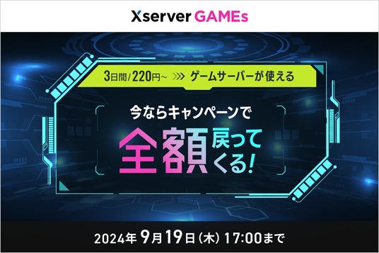 エックスサーバー株式会社(所在地:大阪市北区、代表取締役:小林 尚希)は、2024年8月22日、サーバーの知識不要で簡単にマルチプレイを始められる『Xserver GAMEs』において、全額戻ってくるキャンペーンを開催します。