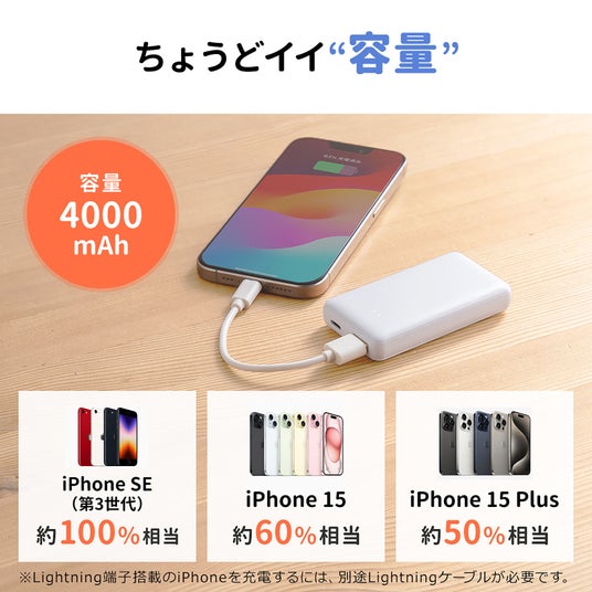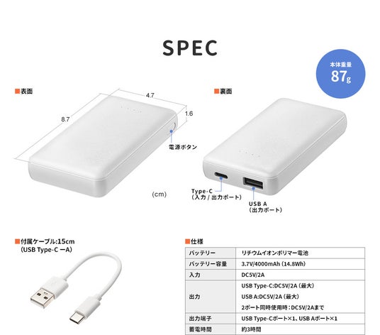 モバイルバッテリー 4000mAh 小型 軽量 Type-C×1 USB A×1 スマホ タブレット 機内持ち込み対応 PSE認証済み モバ充 ホワイト