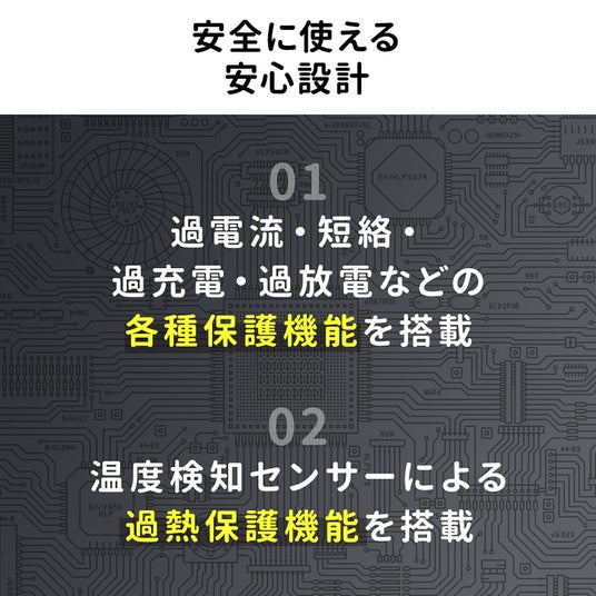 過電流/短絡/過充電/過放電の各種保護機能を搭載し、温度検知センサーによる加熱保護機能も搭載しておりますので、安心してご使用いただけます。また、電気用品安全法(PSE)の技術基準に適合しています。