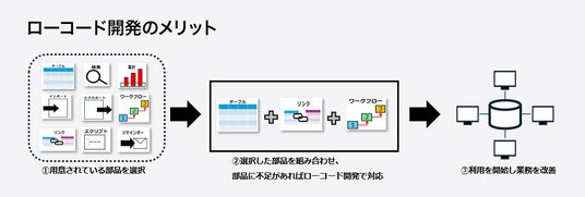 これまでの開発では、必要な機能を時間とコストをかけて開発しておりましたが、ローコード開発では、あらかじめ用意されている機能を組み合わせます。