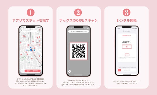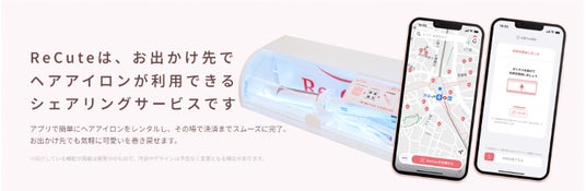 スマートフォンアプリ「ReCute」を用いて、商業施設やオフィスビルなど普段女性が利用する外出先の化粧室で、ヘアアイロンをレンタルできます。