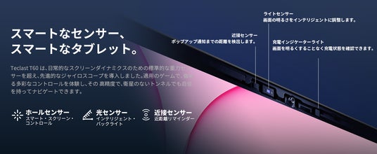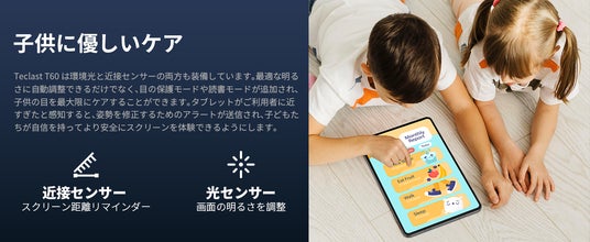 Teclast T60は環境光と近接センサーの両方も装備しています。最適な明るさに自動調整できるだけでなく、目の保護モードや読書モードが追加され、子供の目を最大限にケアすることができます。タブレットがご利用者に近すぎたと感知すると、姿勢を修正するためのアラートが送信され、子どもたちが自信を持ってより安全にスクリーンを体験できるようにします。