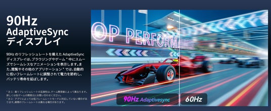 90Hzのリフレッシュレートを備えたAdaptiveSyncディスプレイは、ブラウジングやゲーム中にスムーズでシームレスなアニメーションを表示します。また、閲覧やその他のアプリケーションでは、自動的に低いフレームレートに調整されて電力を節約し、バッテリ寿命を延ばします。