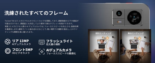 5メガピクセルのフロントカメラを搭載しており、高解像度のビデオ通話が可能なだけでなく、顔認証にも対応してより便利で楽なタブレット利用ができます。背面13メガピクセル素のAIデュアルカメラは、フォーカススピードを向上させ、画像効果を最適化します。補助ライトと組み合わせることで、暗い場所での撮影を強化し、エキサイティングな瞬間を楽に撮られます。