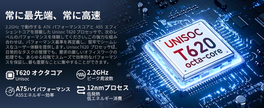 2.2GHzで動作するA75パフォーマンスコアとA55エフィシェントコアを搭載したUnisoc T620プロセッサで、次のレベルのパフォーマンスを体験してください。この強力な組み合わせは、パフォーマンス基準を再定義し、堅牢でシームレスなユーザー体験を提供します。UnisocT620プロセッサは、日常的なタスクの管理でも、要求の厳しいオフィスワークの処理でも、あらゆる段階でスムーズで効率的なパフォーマンスを保証し、最も重要なことに集中することができます。