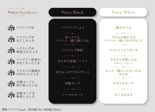 それぞれ異なるガイダンスボイスを搭載。Patra Blackでは「待ってたよ。パトラと一緒に寝ようね」「またね、おやすみ(ハート)チュッ」、Patra Whiteでは「今日もお疲れさま、パトラと一緒におやすみしよ」「そろそろ充電してね。いいこ、いいこ」など、それぞれのコンセプトに基づいた完全新規録り下ろしガイダンスボイス7種類を楽しめます。