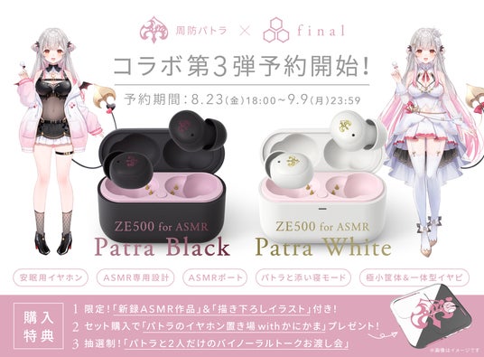 国内オーディオメーカー株式会社final(代表:細尾 満、本社:神奈川県川崎市)は、自社ブランドfinalのZEシリーズよりASMR専用の音質設計を施した未発表新モデル「ZE500 for ASMR」と、超大人気VTuber「周防パトラ」(Youtubeチャンネル登録者数80.1万人/Xフォロワー28.4万人:いずれも2024年8月21日現在)とがコラボレーションした「ZE500 for ASMR -Patra Black-」「ZE500 for ASMR -Patra White-」の2機種の予約を本日2024年8月23日(金)18:00よりfinal公式サイトにて2024年9月9日(月)23:59まで承ります。