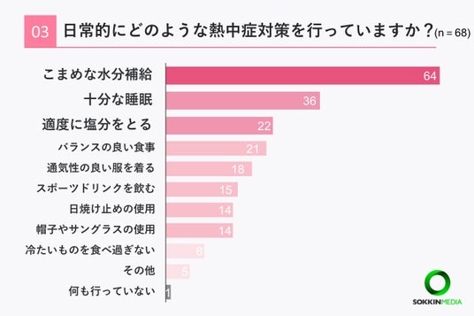 「Q3. 日常的にどのような熱中症対策を行っていますか? 」という問いに対して「こまめな水分補給」という回答が64票と回答者の9割以上に上りました。次いで「十分な睡眠」が36票、「適度に塩分をとる」という回答が22票という結果になりました。