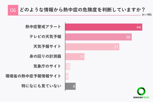 「Q6. どのような情報から熱中症の危険度を判断していますか?」という問いに対して、「熱中症警戒アラート」が最多の44票、次いで「テレビの天気予報」という回答が38票という結果になりました。
