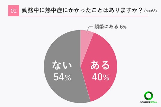 「Q2. 勤務中に熱中症にかかったことはありますか? 」という問いに対して「ある」という回答が46%に上り、中でも6%の方が「頻繁にある」と回答しました。