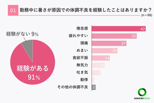 ・9割以上の看護師が勤務中に暑さが原因の体調不良を経験している。最も多い症状は「倦怠感」