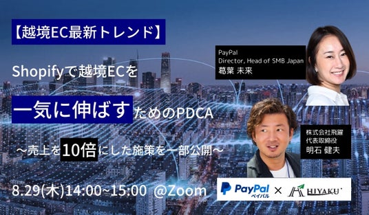 東京と京都を拠点にShopify Plusパートナーとして活躍する株式会社飛躍(本社:東京都港区、代表:明石 健夫 、 Webサイト:https://hiyaku-inc.com) はペイパル東京支店と越境ECをテーマにしたセミナー『【越境EC最新トレンド】Shopifyで越境ECを一気に伸ばすためのPDCA~売上を10倍にした施策を一部公開~』を8/29(木)14:00~15:00にて開催いたします。