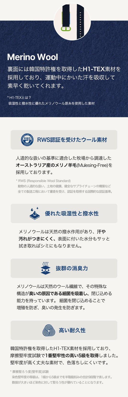 メリノウールはウール素材の中でも高級素材に属しており、吸湿性と撥水性に優れ、天然の抗菌作用により防臭効果が持続します。また、一般的なウール素材に比べて繊維が細いため、柔らかい肌触りの提供が可能です。