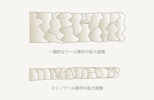 メリノウールは他のウールと比べると繊維がとても細く、クリンプと呼ばれる1本1本の繊維が縮れ、約60%もの空気を含み、外との間に空気の層を作ります。