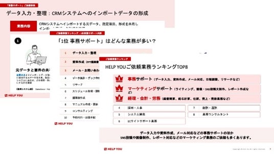 このたび、HELP YOUへのご依頼業務ランキングを公開いたしました。アウトソーシングを検討されているすべての方へのヒントして、具体的な業務例を交えながら、ご依頼の流れや確認事項まで、本資料にてご提供します。
