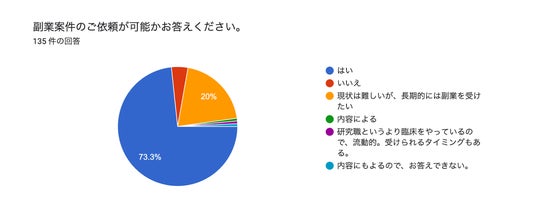 その結果、「はい」と回答した人が72.1%と最も多く、続いて、「現状は難しいが、長期的には副業を受けたい」と回答する人が20.5%と9割以上の研究者が副業への興味を持っていることが明らかになりました。