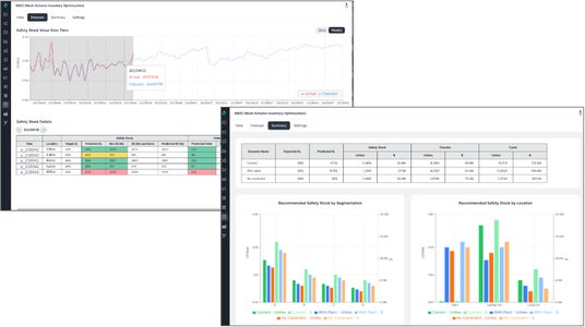 またマルチエシェロン(多階層)在庫最適化の安全在庫量と合わせて、各拠点の在庫状況をリアルタイムで監視し、補充計画や在庫計画のパフォーマンスを評価することができます。