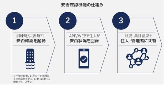 本機能は、外部管理者方式、従来の理事会方式、いずれのマンションにおいても、マンション住人の安否確認を円滑に行うことで、マンションの防災力を強化することを狙いとしています。
