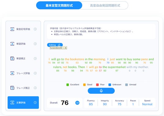 ・伝わりやすさ、流暢さ、発音の観点で点数出力