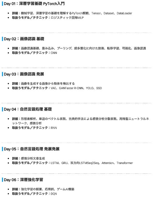 本講座は、JDLAのE資格認定講座対応の(本講座修了認定でE資格への受験資格が取得可能)事例や実体験を交えて行う座学+PyTorchを使った実践的な演習形式で、ディープラーニングに関する内部構造を理解することで最新のモデルを使いこなし、プロダクト開発などに従事できる人材を育成するためにデザインされたカリキュラムです。