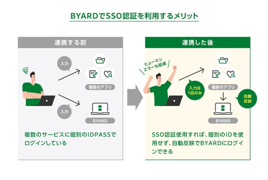 これまで、サービスの利用には「ID/パスワード」での個別ログインが必要でした。「BYARD」をご利用いただくお客様は他のWebサービス・クラウドサービスやアプリケーションをご活用されていらっしゃる企業様も多く、お客様にとって一度の認証により「BYARD」をより便利且つ安心して利用できるサービス提供を行うことを目的とし、本機能の提供を開始しました。
