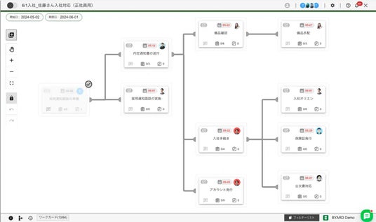 「BYARD」はオペレーション業務の推進を支援するオペレーション・マネジメントサービスです。フロー形のテンプレート「ストリーム」による業務プロセスの可視化や、個別の業務プロセスを記す「ワークカード」上でのタスクやメモ、関係者間のやり取りといった業務に関連する情報の一元管理が可能です。