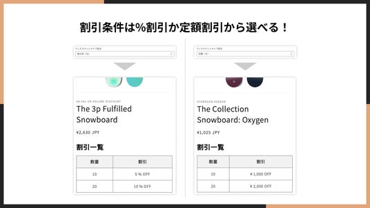 %割引のボリュームディスカウント商品(左)、定額割引のボリュームディスカウント商品(右)