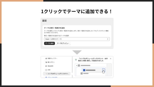 「シンプルボリュームディスカウント|お手軽まとめ買い割引」では、1クリックでテーマに追加できます。