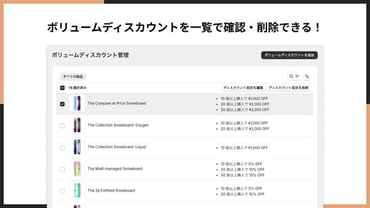「シンプルボリュームディスカウント|お手軽まとめ買い割引」では、ボリュームディスカウント商品を一覧で確認・削除できます。
