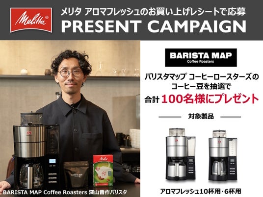 ペーパードリップシステムを世界で初めて考案したドイツのコーヒー専業ブランド メリタの日本法人メリタジャパン株式会社(本社:東京都江東区、代表取締役社長:服部雅能、www.Melitta.co.jp、以下「メリタ」)は、2024年9月2日(月)~2025年1月14日(火)の期間中、挽きたて、淹れたてを手軽に楽しめる、ミル付全自動コーヒーメーカー「アロマフレッシュ(10杯用・6杯用)」のお買い上げレシートで応募できるキャンペーンを開催いたします。応募してくださったお客様の中から抽選で合計100名様に、バリスタマップコーヒーロースターズで焙煎されたコーヒー豆をプレゼント。専用の応募フォームに必要事項を入力の上、撮影したお買い上げレシート画像を添付するだけの簡単な応募方法です。