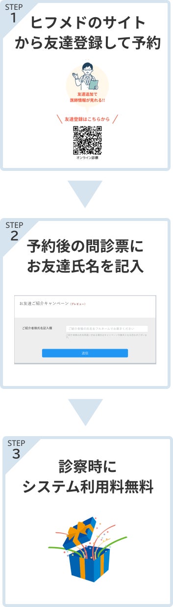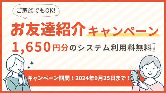 - 紹介された方が初めて受診を行うごとに次回システム利用料1,650円が無料※紹介人数に制限はなく、キャンペーンは何度でも適用されます。 (例:2名紹介で次々回も無料)※有効期限は設けていません。複数のご紹介がある場合、受診ごとにキャンペーンが適用されます。