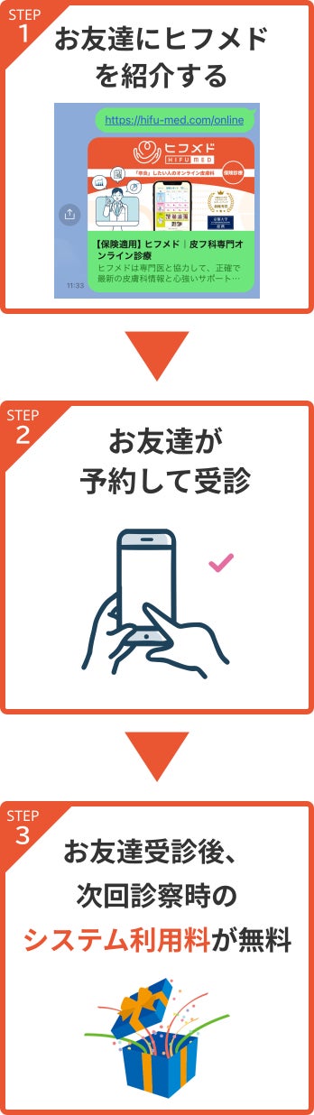 - 紹介者がお友達やご家族に「ヒフメド」を紹介。