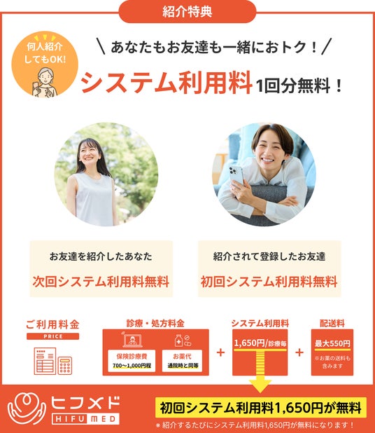 皮膚科専門オンライン診療サービス「ヒフメド」が友達紹介キャンペーンを開始!紹介者も紹介されたお友達も本来1,650円かかるシステム利用料が無料になるチャンス!