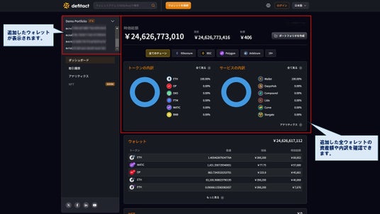 ポートフォリオ機能イメージ1: 複数のウォレットをまとめて資産管理可能。