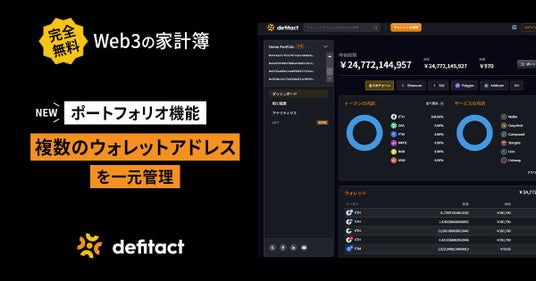Web3家計簿サービス「defitact(読み方:ディファイタクト)」は、 複数のウォレットアドレスを一元管理できる「ポートフォリオ」機能をリリースしました。さらに、pafinアカウントとの統合によりアカウント作成やログインが可能となりました。自身のウォレット情報や作成したポートフォリオを保存しいつでも閲覧できるようになることに加えて、今後pafinが運営する仮想通貨の自動損益計算サービス「クリプタクト」との連携の強化も予定されており、仮想通貨をより効率的に一元管理することが可能になります。本サービスは完全無料でご利用いただけます。