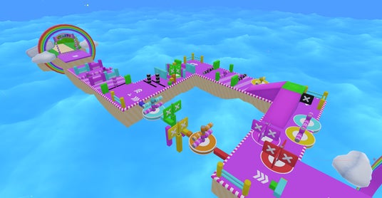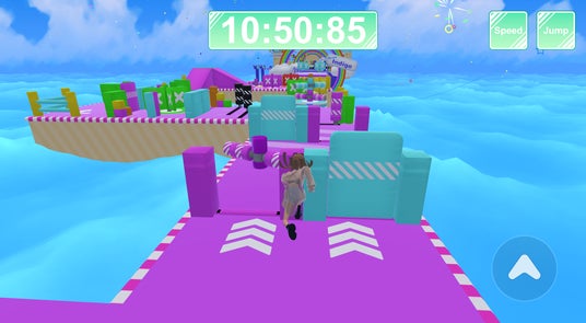 今回は、ZEPETO上でゲーム性を重視したアスレチックレースを楽しめる構成にしました。異なる障害物が配置された7つのエリアを通り抜けゴールを目指す、アスレチック風のタイムアタックが体験できます。 それぞれのブロックは虹をイメージした7色のカラーで彩り、ZEPETOらしい華やかさを演出しました。