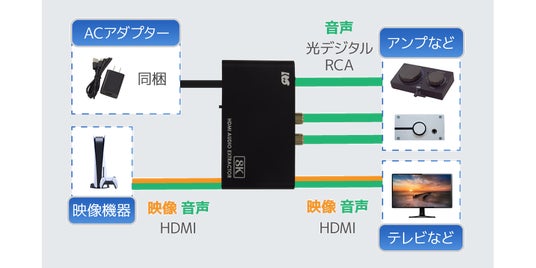 RS-HD2HDA-8Kは、HDMI信号から音声信号を分離し、光デジタルやRCAで出力する製品です。