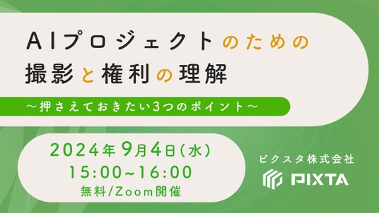 ピクスタ株式会社(東京都渋谷区 代表取締役社長:古俣大介、東証グロース:3416、以下「ピクスタ」)が運営する、写真・イラスト・動画・音楽素材のマーケットプレイス「PIXTA(ピクスタ)」(https://pixta.jp)は、機械学習用の画像・動画データセットの撮影に関する権利について解説する無料ウェビナーを、9月4日に開催いたします。