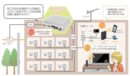 小型CMTS『EC1000』(親機)を建物内の既設テレビ共聴設備に接続するだけで、建物内の全ての