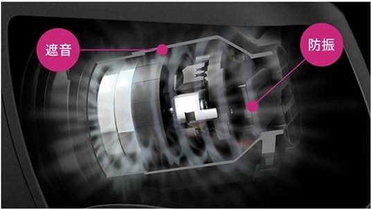 遮音防振構造モーターを覆う遮音カバーや防振材で運転音と不快音を低減し、やさしい運転音を実現。
