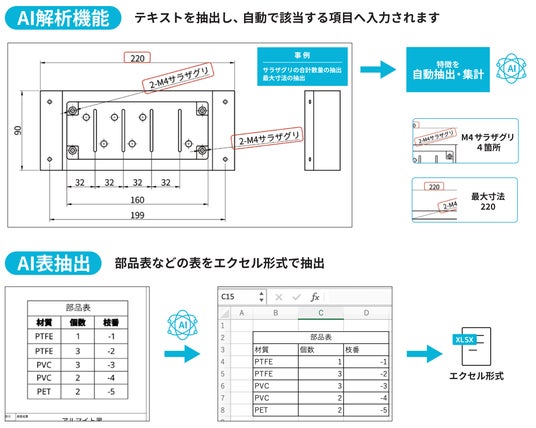 「AIテキスト抽出・解析」機能は、投入した図面から材質・図番・商品名・数量などのテキスト情報をAIが自動で項目別に抽出し、また最大寸法や穴数などご要望のキーワードの集計も自動で実行できる機能です。自動登録された全てのテキスト情報はキーワードとして検索対象になり、さらに図面上の表自体の抽出もエクセル形式で可能。従来、人が図面を見て入力・転記していた作業が不要になり、間接業務の作業負担軽減を通じて大幅な業務効率化を実現できます。