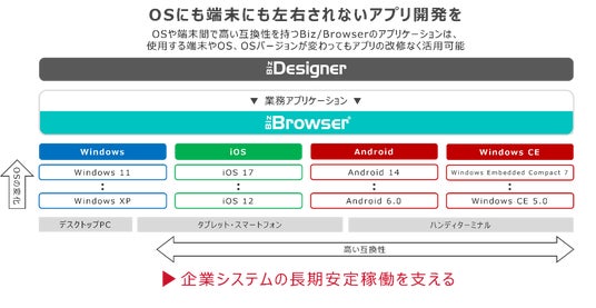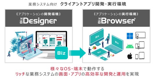 誕生から25年2,800社以上の導入実績を誇る「Biz/Browser」は、業務システム向け クライアントアプリ開発・実行環境です。様々なOS・端末で動作するリッチな業務システムの画面・アプリの高効率な開発と運用を実現します。