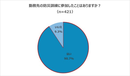 「定期的の実施している」と回答した人に対し、「勤務先の防災訓練に参加したことはありますか」と質問をしたところ、「はい」90.7%だった。