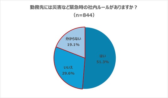 「勤務先には災害など緊急時の社内ルールがありますか」との質問に対し、「社内ルールがある」と回答した人が51.3%、「社内ルールがない」29.6%、「分からない」19.1%で、約5割が緊急時の社内ルールがない実態が明らかとなった。