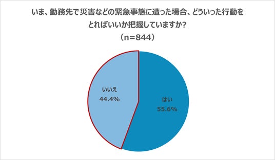 「いま、勤務先で災害などの緊急事態に遭った場合、どういった行動をとればいいか把握していますか」との質問に対し、「いいえ」と回答した人が44.4%。