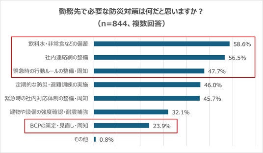 「勤務先で必要な防災対策は何だと思いますか」と質問をしたところ、最多の回答は「飲料水・非常食などの備蓄」58.6%、次いで「社内連絡網の整備」56.5%、「緊急時の行動ルールの整備・周知」47.7%。また、「BCPの策定・見直し・周知」は23.9%だった。