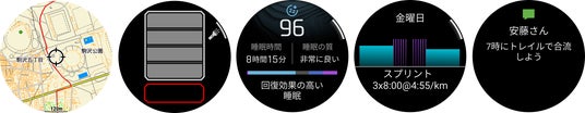 左から、日本詳細地形図、フラッシュライト、睡眠スコア、おすすめワークアウト、通知機能 ※画像はイメージで実際と異なることがあります。