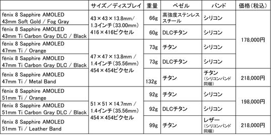 「fēnix 8 Sapphire AMOLED」シリーズ 3サイズ/8モデル